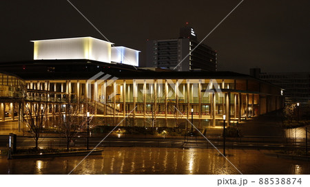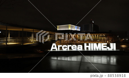 ロシアのウクライナ侵攻に抗議するため、ウクライナ国旗の色に一部が電飾されたアクリエひめじ