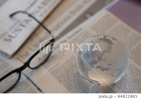 ガラスの地球儀と英字新聞 世界情勢のニュース イメージ(2022年9月)