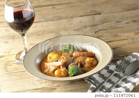 ブロッコリーや人参、しめじなど沢山の具材が入っているビーフシチューと赤ワイン