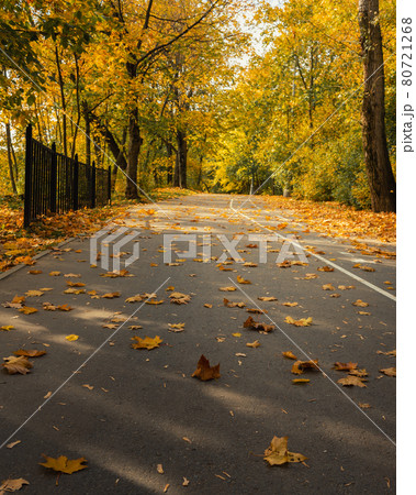 pile of yellow leaves fall on the floor. Background of colorful autumn leaves on the street.