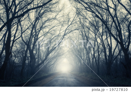 Dark foggy forest. Mystical autumn forest