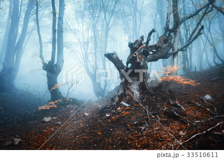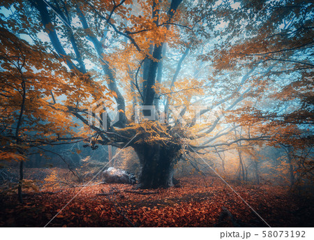 Mystical autumn forest in fog. Magical old trees