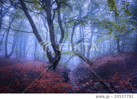 Autumn forest in blue fog. Mystical autumn trees