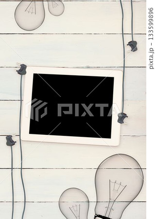 Tablet and plugs on wooden background