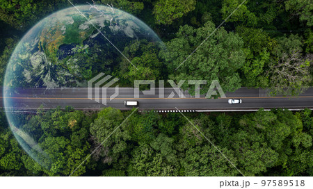 Eco car on forest road with earth planet going through forest, Ecosystem ecology healthy environment road trip travel, Eco car with nature, Electric car and earth EV electrical energy for environment.