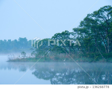 野鳥が飛び水面反射するウトナイ湖「秋の北海道」