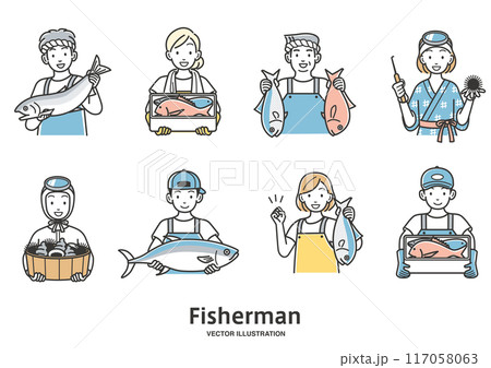 漁業を営む漁師と海女のイラストパターン