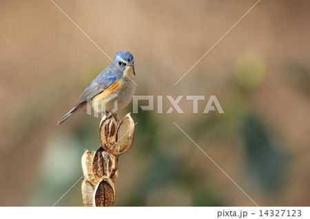 紅葉バックにウバユリの上でポーズを取るルリビタキ