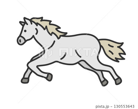 横から見た、走っている芦毛の競走馬(線画カラー)のイラスト