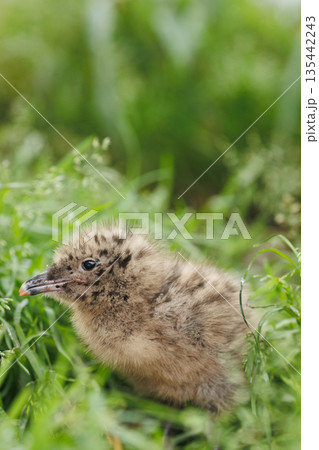 草むらに居るウミネコのヒナ(天然記念物)