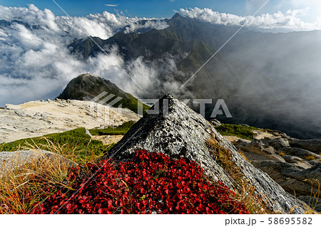 甲斐駒ヶ岳山頂のウラシマツツジの紅葉と雲湧く北岳