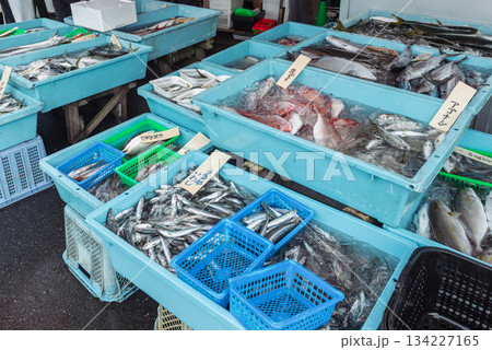 魚市場に並ぶ鮮魚と水揚げされた魚介類
