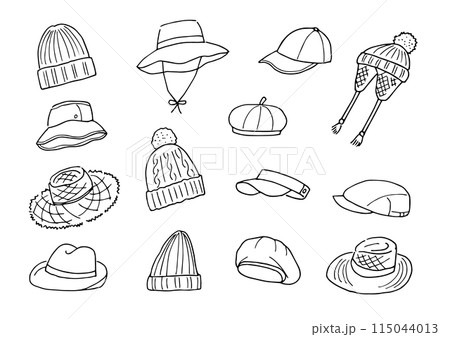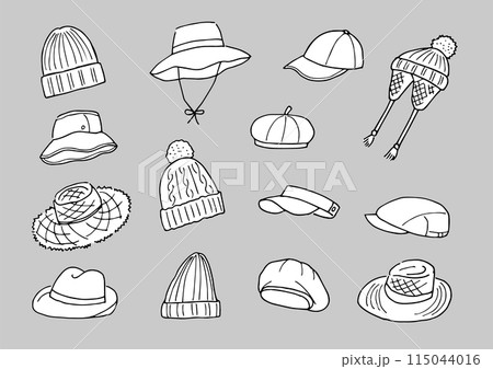 帽子のイラストセット(手描き)モノクロ(背景白)