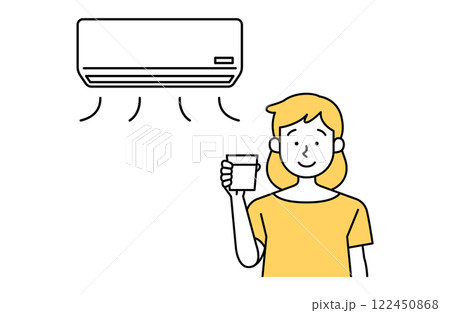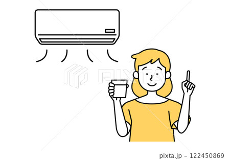 熱中症対策をする女性のベクターイラスト エアコン 水分補給 熱中症予防 シンプル かわいい