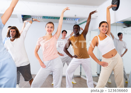 Smiling young woman rehearsing modern dance with group in dance school