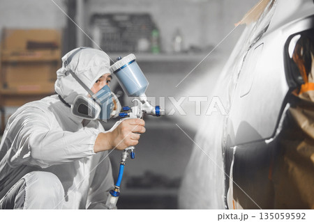 Car repair painter in protective overalls and painting a respirator car wing in the paint chamber