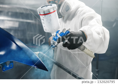 Car paint worker spraying blue paint to car body element using spray gun in vehicle workshop chamber. Complex restoration of automobile body.