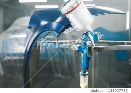 Close up of paint spray gun in garage chamber on painted car background. Restoration painting of automobiles in auto service.