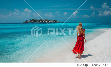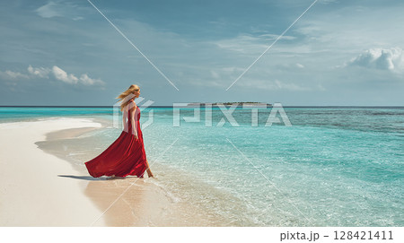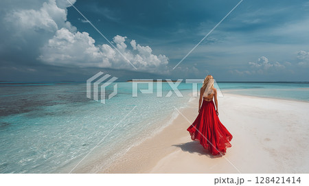 赤いドレスの女性が歩く美しいビーチとターコイズブルーの海