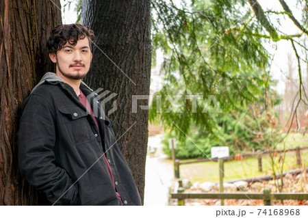 木の下でもたれかかったほほ笑んでいる外国人男性