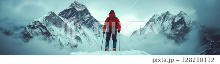 An adventurer stands on a snowy peak, surrounded by misty mountains. Concept of exploration and adventure. For outdoor activity inspiration