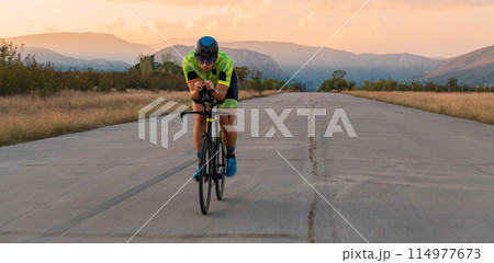 Triathlete riding his bicycle during sunset, preparing for a marathon. The warm colors of the sky provide a beautiful backdrop for his determined and focused effort.