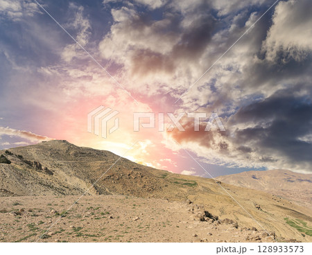 Typical mountain landscape, Jordan, Middle East (photography from a high point). Against the background of a beautiful sky with clouds