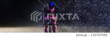 A triathlete braving the rain as he cycles through the night, preparing himself for the upcoming marathon