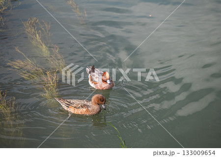 琵琶湖疏水を泳ぐヒドリガモ(オスのエクリプスとメス)