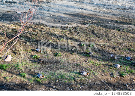 雪が溶けた岩手県盛岡市中津川の土手で顔を出した草を食べるヒドリガモの群れ