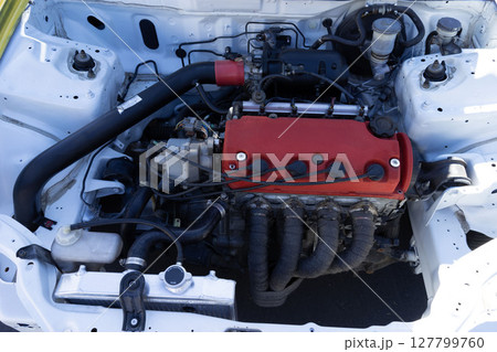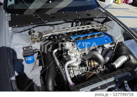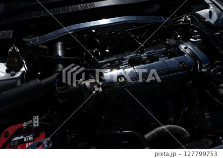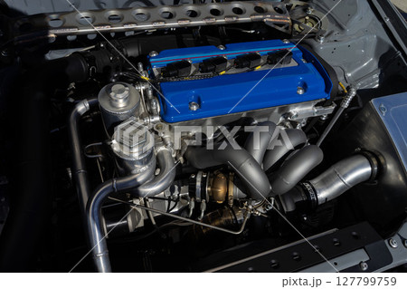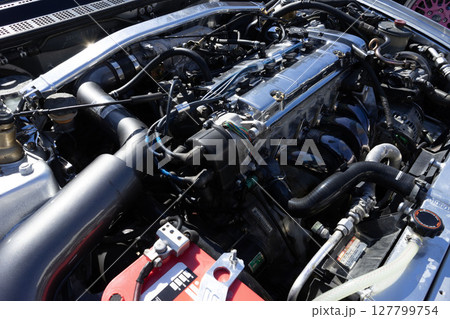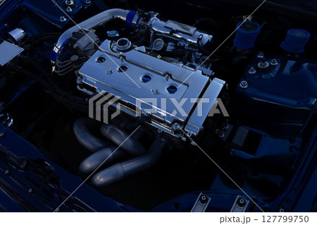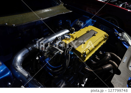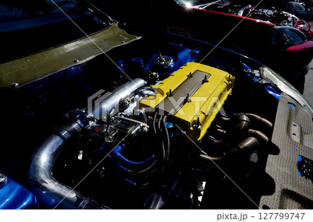 自動車のエンジン、改造車のボンネットの中、チューニングマシン