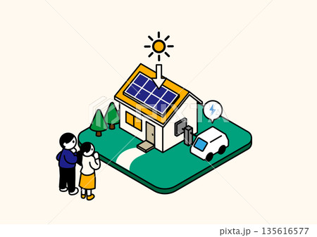 太陽光発電とV2Hを備えた高性能住宅を見学する夫婦のアイソメトリックイラスト