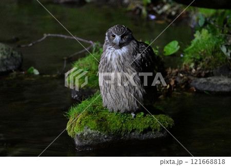 北海道羅臼の渓流の川岸の石の上で魚を探すシマフクロウ