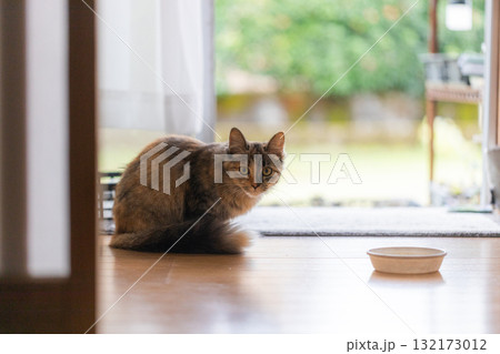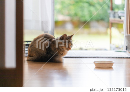 縁側でくつろいでいるかわいい子ネコとエサ入れ