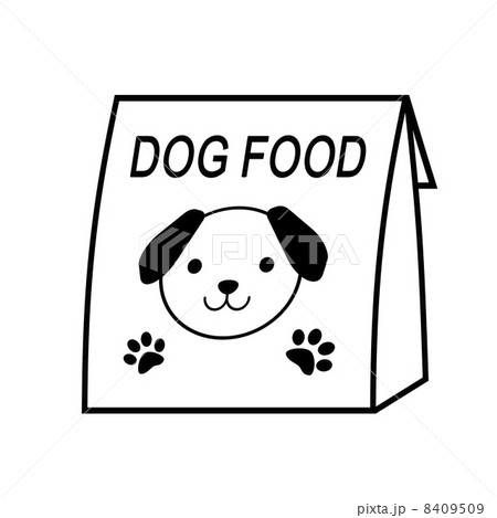 ドッグフードの袋とエサが盛られたペット皿のイラスト