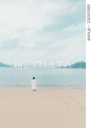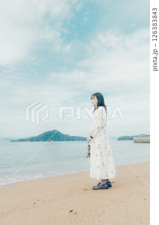 穏やかな海とランタンを手にした女性の後ろ姿