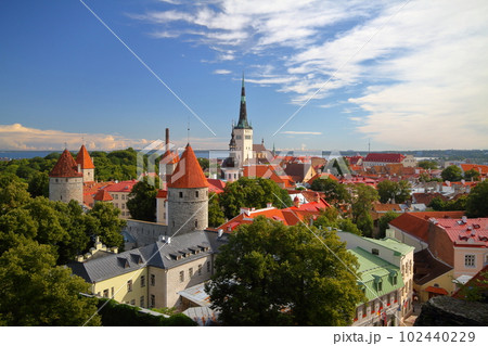 エストニアの首都タリンの美しい旧市街 赤い屋根と中世の塔が並ぶ世界遺産の街並みを展望台から望む風景
