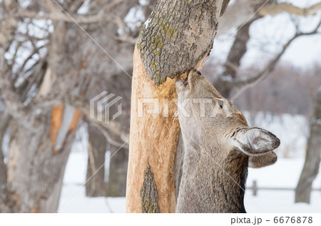 樹皮を齧る厳冬期のエゾシカ[メス成獣/2‐1]