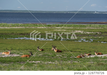 北海道・野付半島の草原で草を食むエゾシカ(学名 Cervus nippon yesoensis)