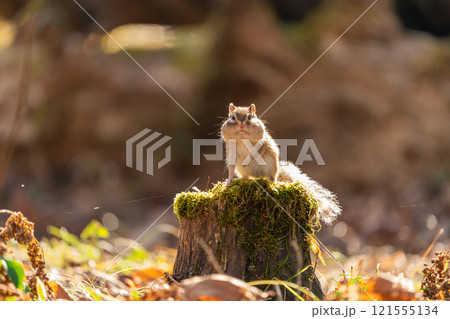 朝日さす晩秋の森で日向ぼっこするエゾシマリス