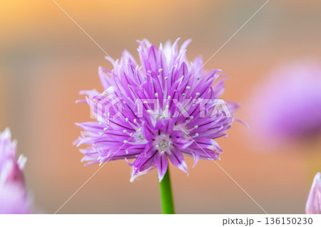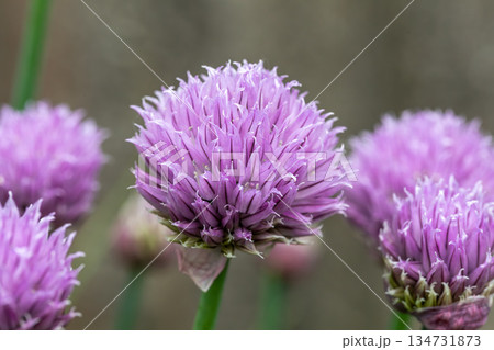 Chives, Allium schoenoprasum purple flowers and leaves, closeup macro of bloom flower. Popular garden plant, usage in kitchen and cooking.