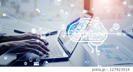 オフィスでノートパソコンを使うビジネスパーソンとAI・人工知能のコンセプト