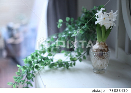 窓辺に置いた水耕栽培の白いヒヤシンス