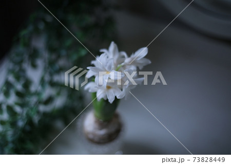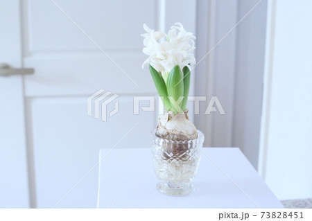 白い部屋に咲いた水耕栽培の白いヒヤシンス