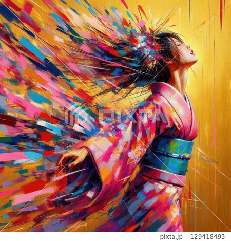 Abstract Portrait of a Woman in Traditional Kimono with Flowing Hair and Colorful Brushstrokes on Golden Background with Generative AI.