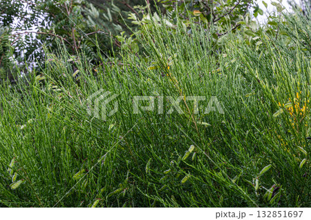 Cytisus scoparius blooms in a sunny meadow showcasing vibrant green seed pods and thriving foliage during springtime growth