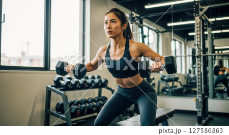Woman portrait in sportswear during training at gym, fitness girl doing workout