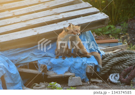 中の良さそうなキタキツネ2匹(北海道斜里郡斜里町)