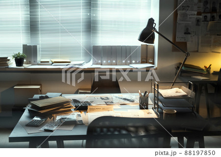 Lamp lighting workplace of contemporary FBI agent with criminal profiles