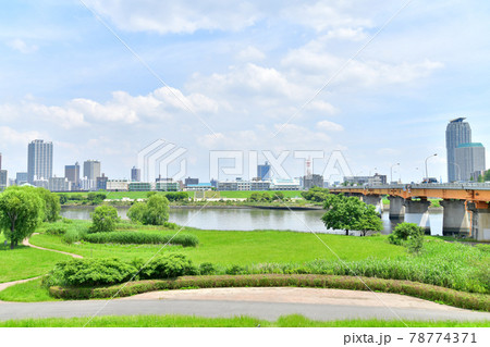 青空が広がる荒川の川原と川口市の高層ビル街